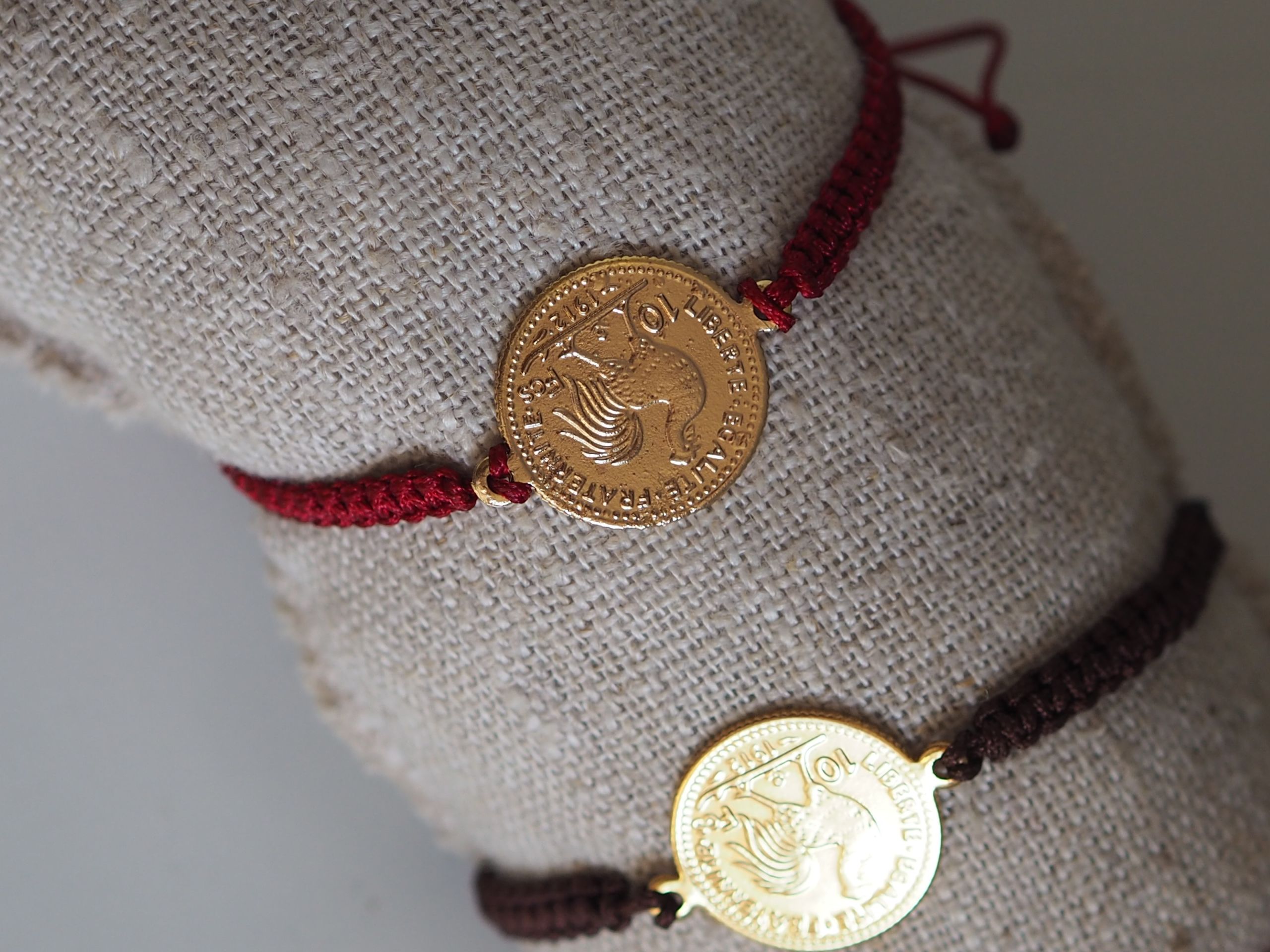 Ce bracelet en lien coton met à l’honneur une pièce gravée des devises françaises : liberté, égalité, fraternité.